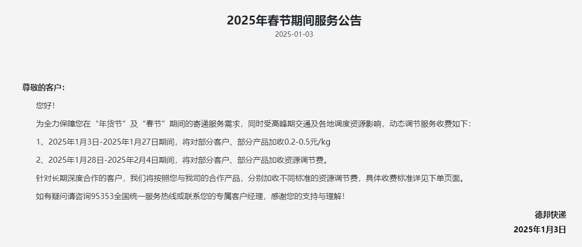 德邦快递:公告显示,为全力保障消费者在“年货节”及“春节”期间的寄递服务需求,将动态调节服务收费。1月3日-1月27日期间,将对部分客户、部分产品加收0.2元-0.5元/kg,1月28日-2月4日期间,将对部分客户、部分产品加收资源调节费。